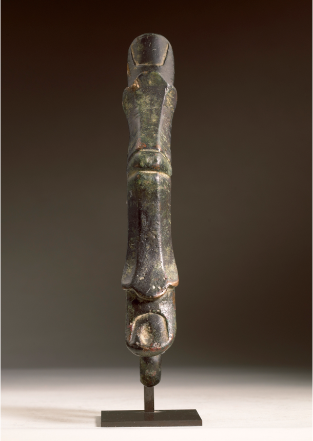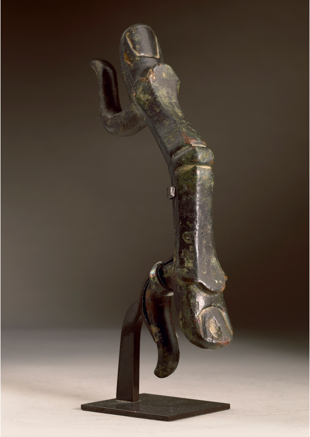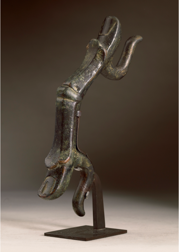 The present work is a rare Roman bronze handle modelled in the form of two thumbs. As with their Greek predecessors, the Romans implemented elaborate ornamentation in the craft of their various vessel handles. Cast in bronze, these handles were fashioned into a wide variety of forms, including serpents, acrobats, deities, animals, and knotty tree branches. Notably, a pair of bronze handles in the form of human hands were discovered in Pompeii. They are believed to have been used to carry large bowls, stoves, and other heated vessels, allowing them to be conveniently lifted. This splendid example may have been used to lift a cooking pail, which, when placed over a charcoal fire would have become extremely hot; in such a context, a separately cast, cool bronze ‘hand’ would have been highly functional, providing a practical solution for handling heated vessels safely.