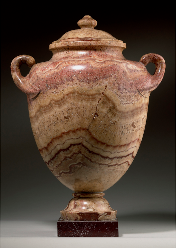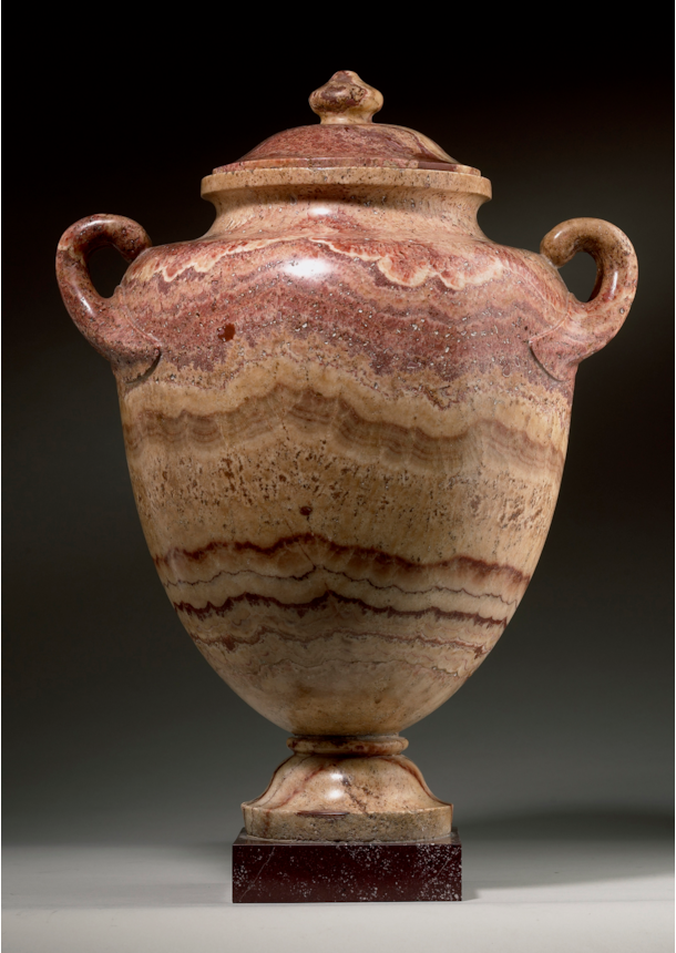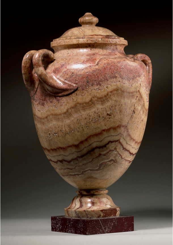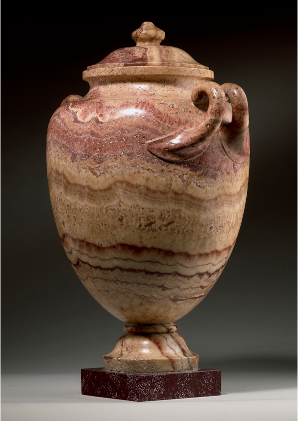 The present vase is a two-handled urn sculpted from Alabastro Lisato. ‘Lisato’, meaning striped in Italian, describes the distinctive banding or veining present in this specific type of alabaster. Revered for its unique veining, remarkable warm hues, and stunning lustre, this stone is exceptionally rare, with a history of use and admiration dating back to antiquity.
