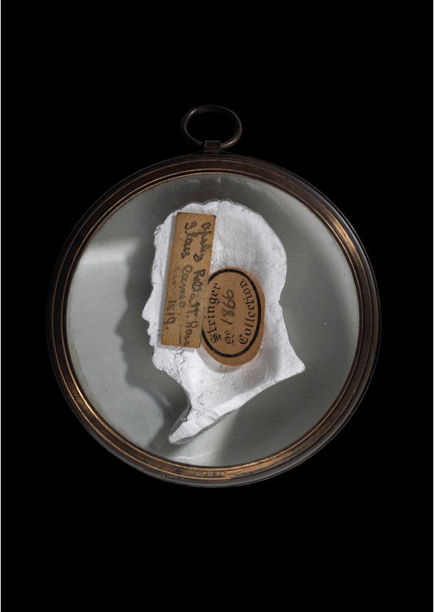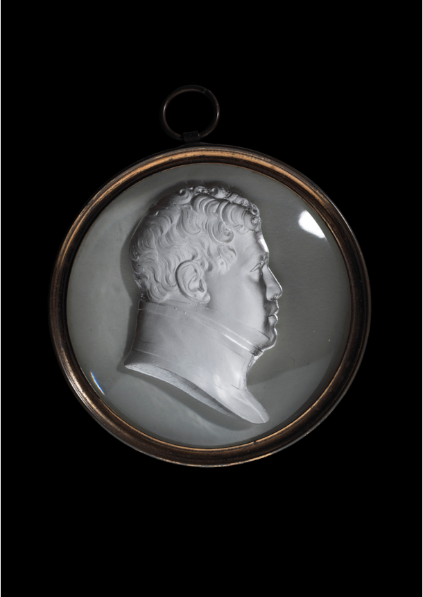 A rare early 19th century sulphide cameo medallion depicting Kamehameha II; the second king of the Kingdom of Hawaii, attributed to Apsley Pellatt, circa 1824, unsigned, set in contemporary gilt metal frame, collection label to reverse for the "Stringer Collection" and numbered 1866, handwritten label to reverse.