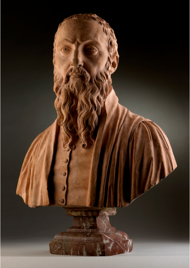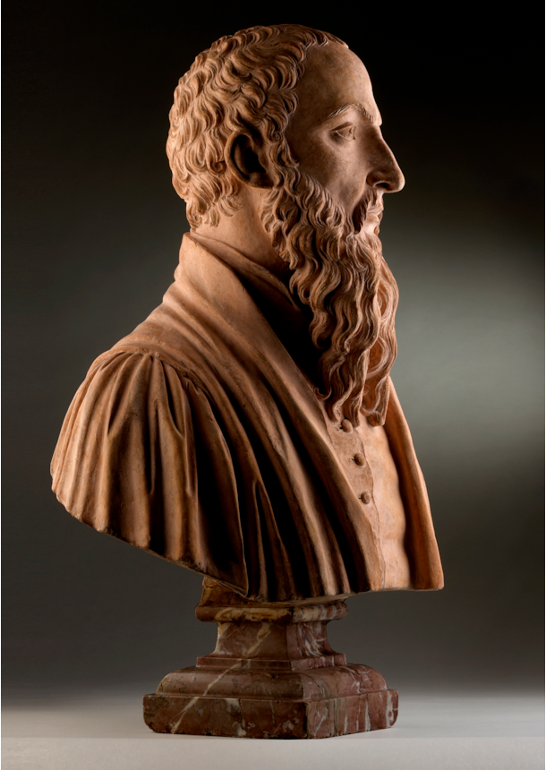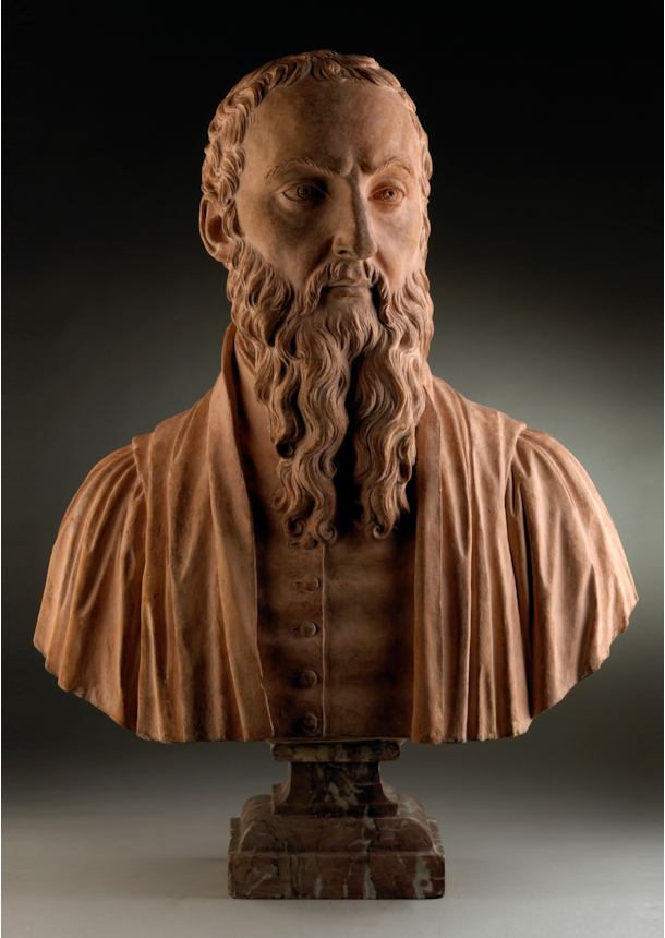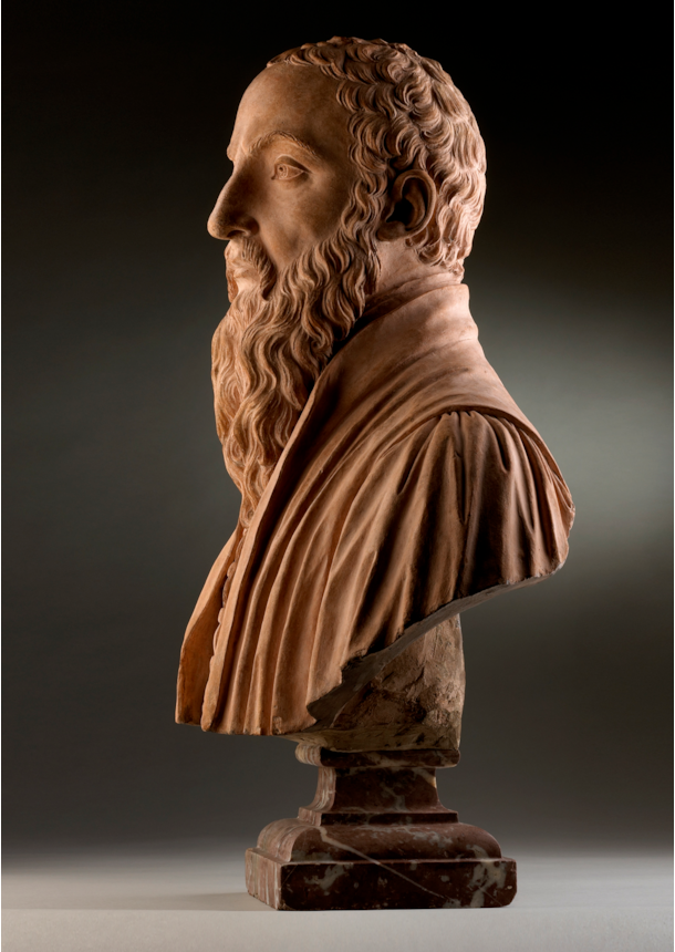 Our bust depicts the French Renaissance philosopher and essayist Michel de Montaigne, at a mature age, with a studious gaze and a characteristically long beard. This well-preserved terracotta was made by Godecharle as a model for his bust of Michel de Montaigne for the garden of the Château de Wespelaer, near Leuven/Louvain, Belgium, now housed at the Musée d’Art Ancien, Brussels (inv. 3496).
