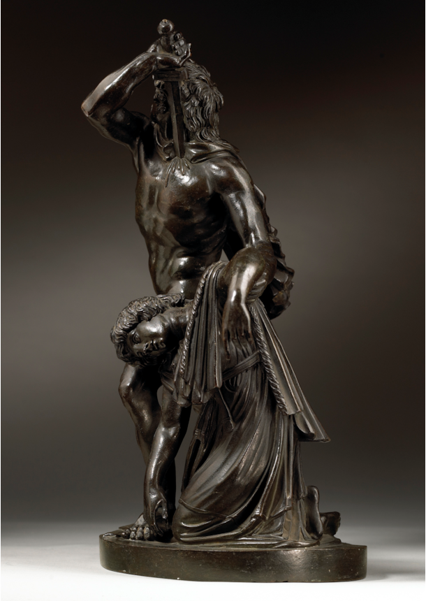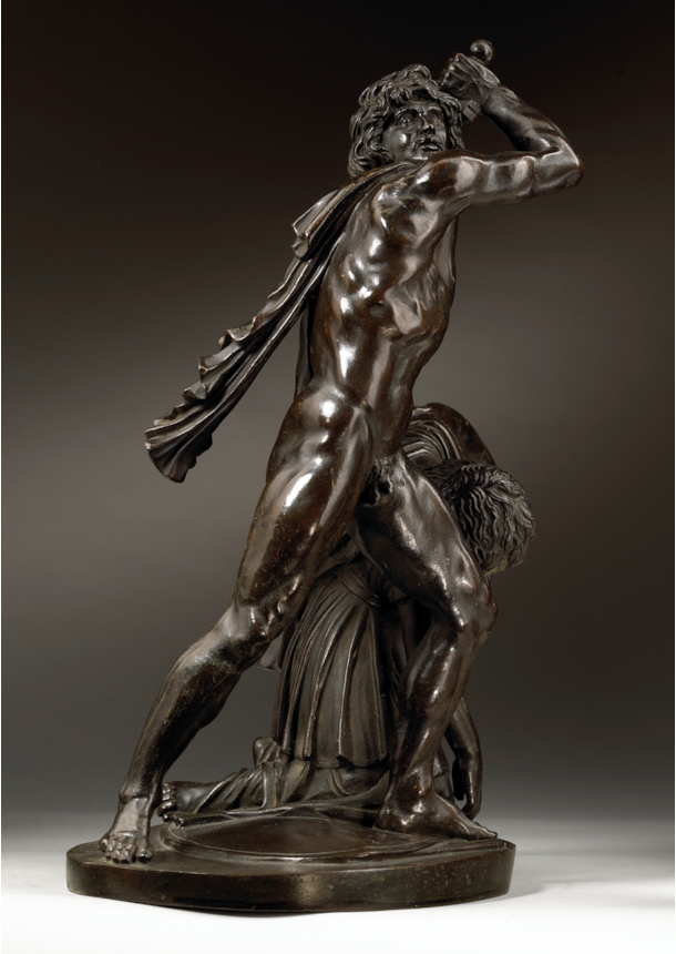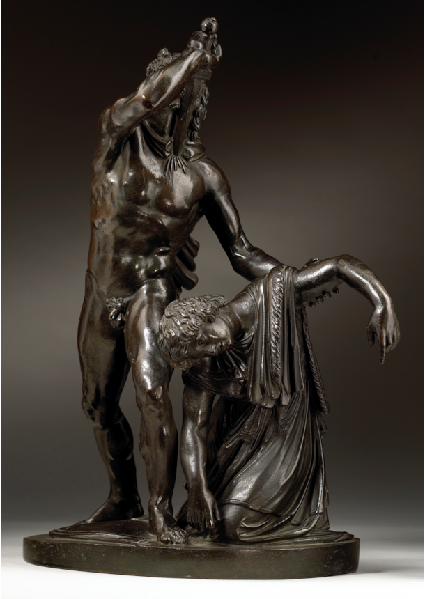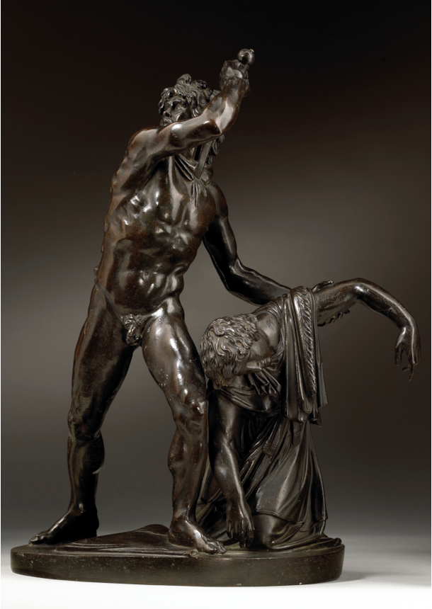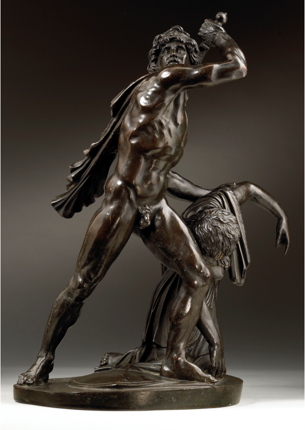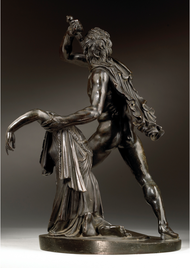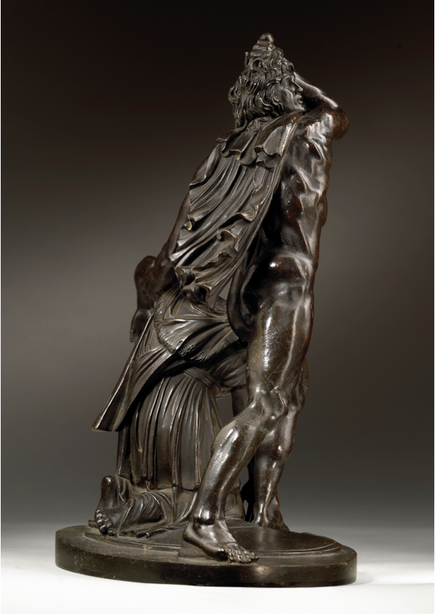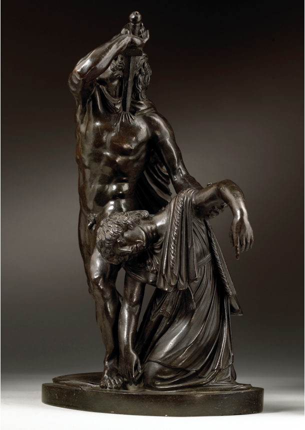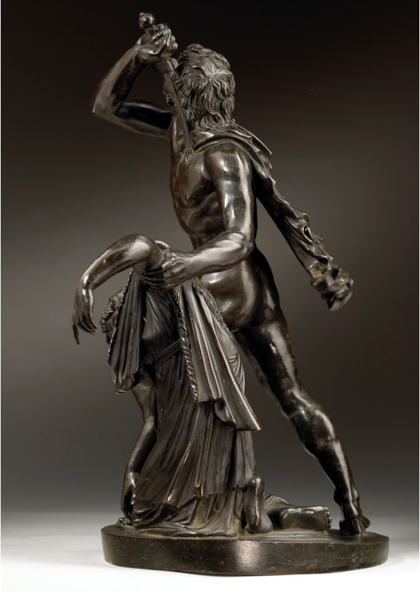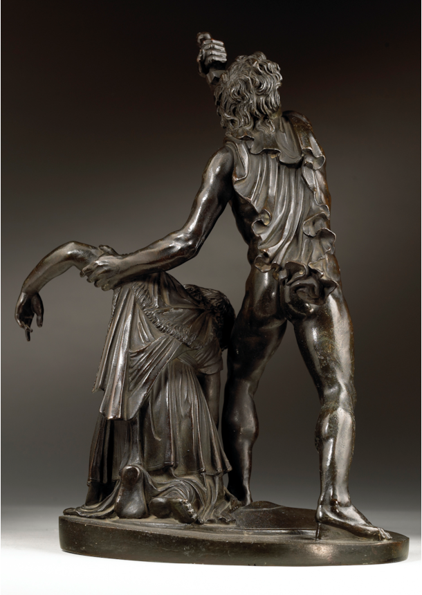 Artists working in Rome echoed the admiration that the marble group attracted and began making reductions in bronze, such as the present example. The high quality of the modelling, together with the fine workmanship of its surface, distinguish the present work and point to its production in an established Roman workshop. The characteristic dark patina and the excellence of the cast and chasing are further indicators that it comes from the Valadier workshop, located in Via del Babuino. Ran successfully by the pre-eminent Roman silversmith and bronze founder Luigi Valadier (1726–1785) until his death in 1785, the workshop continued to operate under the direction of his son Giuseppe Valadier (1762-1839). Renowned for the excellence of their casts, the Valadier workshop produced many bronze reductions of famous classical statues, on both a large and small scale, which closely compare to the present bronze. Its connection to the Valadier workshop is further confirmed by the Registro Generale of 1810, an inventory which documents the contents of the workshop when it belonged to Giuseppe, in which we find listed the model of the present bronze: ‘Gruppo di Aria e Peto (‘Arria and Paetus group’, in unspecified material) 3.50 scudi’ (González-Palacios 2018, pp. 479).