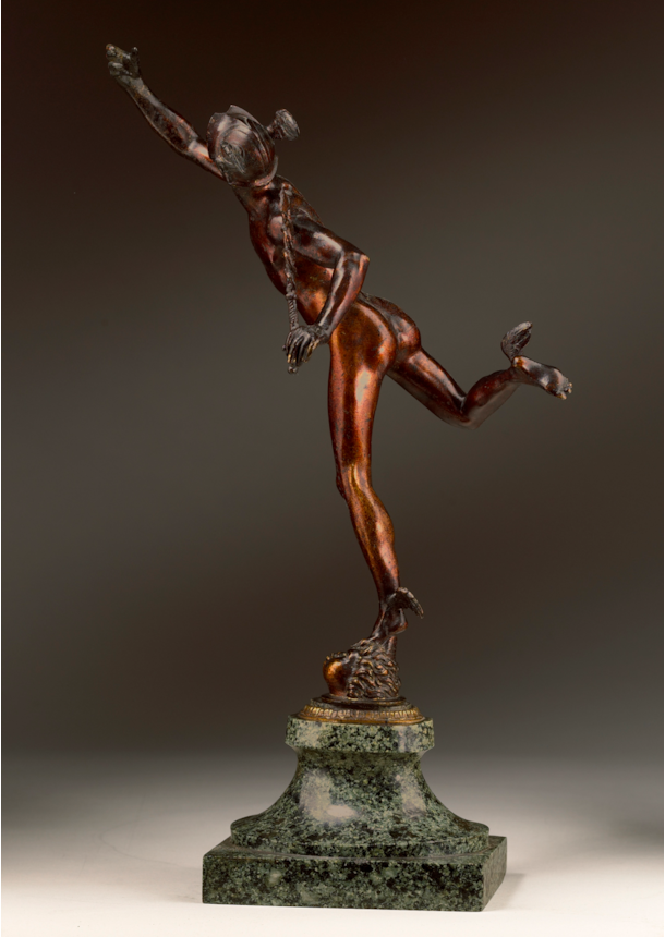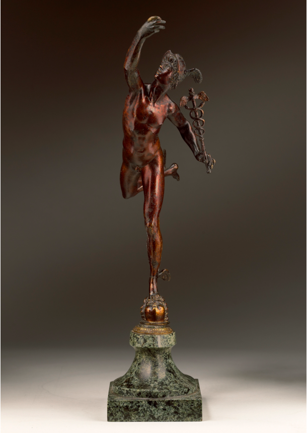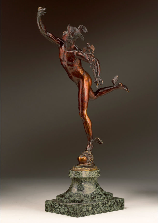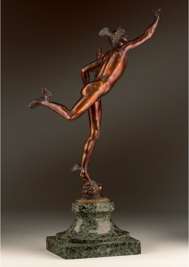 The present bronze is a finely cast statuette of the so-called ‘Flying Mercury’. The ancient Roman messenger of the gods, and patron of travellers and commerce, balances almost weightlessly on the tips of his toes, his right foot raised and his left arched, as if about to lift entirely from the ground. The wings on his ankle and cap, iconographic attributes of the god established in antiquity, further suggest to the viewer the figure is about to take flight. The body, carefully modelled, stretches forward, while the figure’s eyes glance up towards his right hand that points at the sky, an allusion to the higher power of the Olympian gods above.
