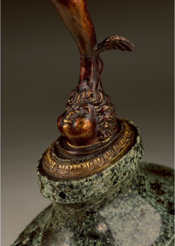 The physiognomy of Mercury’s face, with the wide open and clearly delineated eyes, oval shape, and delicately rendered curled locks of hair suggest a high Baroque date yet deriving inspiration from an earlier model.