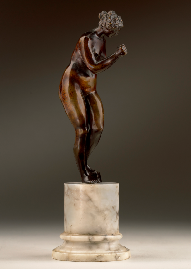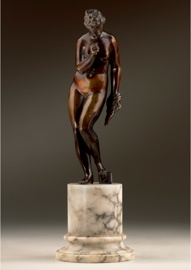 This fine bronze represents a rare variant of a model by the Venetian sculptor, Nicolò Roccatagliata (circa 1569-1629). Published by Weihrauch (op. cit.) with an attribution to Tiziano Aspetti (1559-1606), the bronze of Venus chastising Cupid in the Museo Nazionale in Trent was given to Roccatagliata by Radcliffe (op. cit.) and is now generally accepted as his work. Roccatagliata’s playful bronze shows the nude goddess, now standing alone, with an integrally cast scourge in her right hand, and a book in her left, as if to strike the pair of putti that would have been playing at her feet. Though near-identical, the present model differs from the Trent bronze in the substitution of the book for a drape in Venus’ left hand, the separate casting of the (now-lost) scourge.