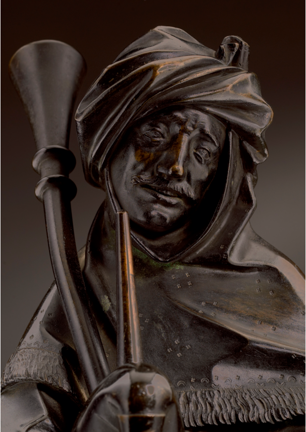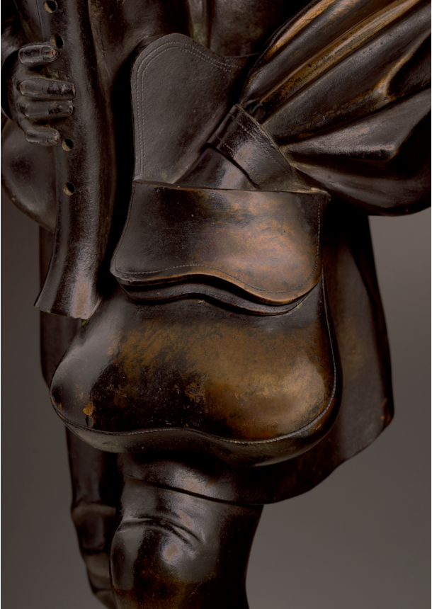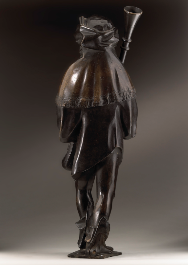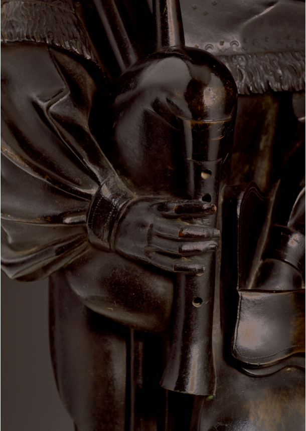 Although the wooden sculpture now lacks the drone (upwards pipe) and blowpipe, these had been missing prior to its publication in 1888, the present bronze preserves these features, confirming its casting from the model prior to their loss. Moreover, the correspondence between the cavity at the back of the wooden figure and the fitted panel on the reverse of the bronze strongly suggests a direct technical relationship between model and cast, indicating that the present work was produced from the original or from a mould taken from it.