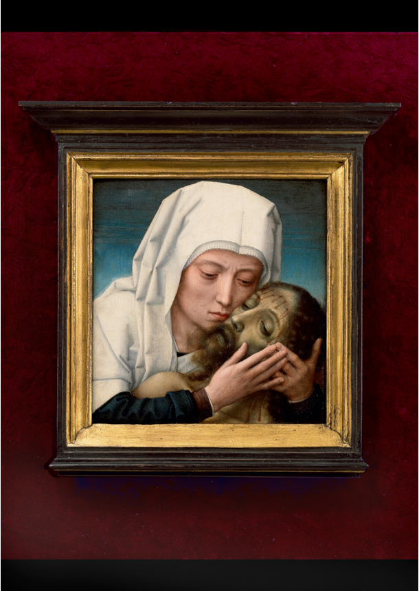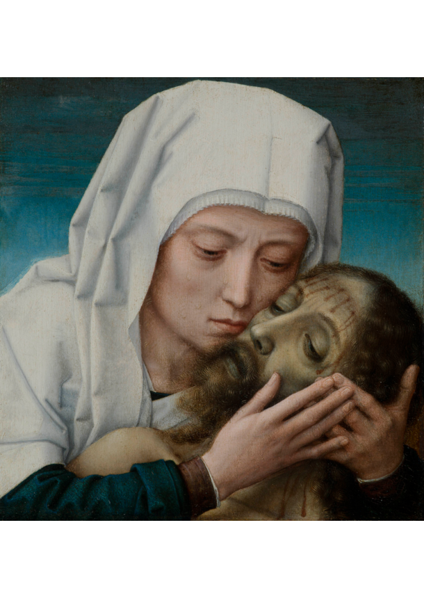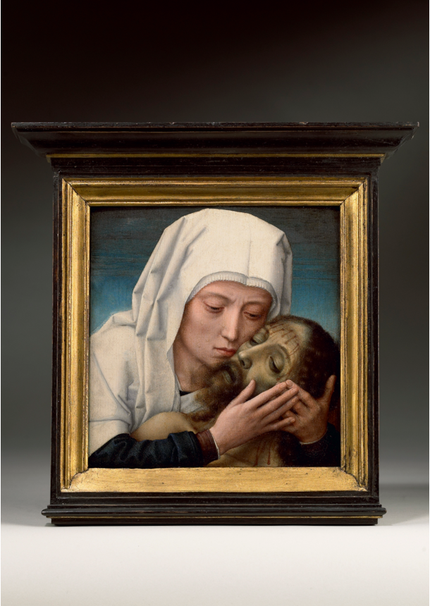 This beautiful, very intimate small gem with the Virgin Mary holding the head of her dead Son close to her tearful face, is one of the many versions of this composition that Max J. Friedländer and Hans van Miegroet linked to Gerard David and his studio. Both art historians regarded a version from the collection of Hans Wetzlar in Amsterdam as the original, all others by David’s studio or later imitators. That view needs some revision, though. First and foremost, the present picture that only surfaced quite recently from a private collection in France was not taken into account by Friedländer and Van Miegroet. However, the painting must have been known to Max Friedländer, since a photograph of the picture in a gold frame in the Friedländer archive at the Netherlands Institute for Art History (RKD) in The Hague carries an original text on the back that states: “v. Tsch. empf. / 95 / Spanien”. Apparently Friedländer received the photograph from Hugo von Tschudi, his colleague at the Berlin Royal Picture Gallery. There can be little doubt that the painting in this photograph is identical to our painting. Unfortunately, nothing is known about its exact whereabouts in 1895, nor do we know exactly what happened to the painting until it was auctioned in Paris in June 1952, as School of Quinten Massys. After that sale the picture remained in France until it recently resurfaced. The frame that is displayed on the nineteenth-century photograph shows the number 50, a possible indication that the painting was once part of a museum- or important private collection.