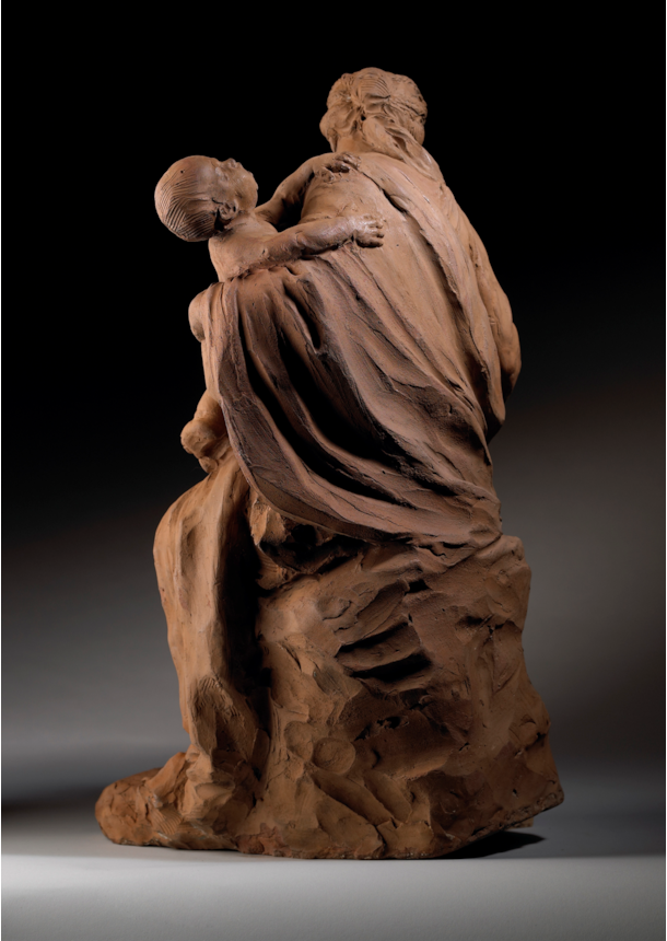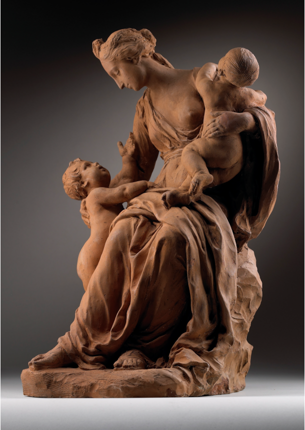 Close resemblances in terms of facial features and posture exist between the standing child in the Musées royaux group and that in our terracotta. Both lift their arms in the air seeking the female figure’s embrace, a motif that reappears in a drawing by Van der Voort now in the Museum Plantin-Moretus in Antwerp. The similarities are equally striking between the infant being held in the woman’s arms in our terracotta and the one sleeping in the marble group. The same type of figure, with a willowy yet plump anatomy, oval face, high forehead and smooth hair, is repeated by Van der Voort, for example, in the two genii in the funerary monument to Count Prosper Ambrosius de Precipiano, and in one of the putti that sits at the foot of the statue of Saint John for the choir door in St James’ Church in Antwerp (1723).