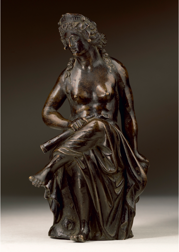 This beautifully-modelled and conceived figure is the finest of a group of four bronze statuettes that are likely to have been made in a still to be identified Paduan workshop, probably in the period c. 1530-50. The statuette of the muse Euterpe, derived from the antique marble sculpture known as the Ninfa alla spina, demonstrates on the part of its maker a sophisticated knowledge of the two earlier outstanding bronze reductions from that model, by Giovanni Fonduli and Antico. The sculptor of the figure took elements from both small bronzes, as well as the work of Andrea Riccio, to create a figure that carries its own powerful presence and its own haunting beauty. Beyond its intrinsic power as a very fine example of the Renaissance bronze, the subject of the muse of music and lyric poetry takes us to the beating heart of artistic, literary and musical culture in Renaissance Padua and Venice.