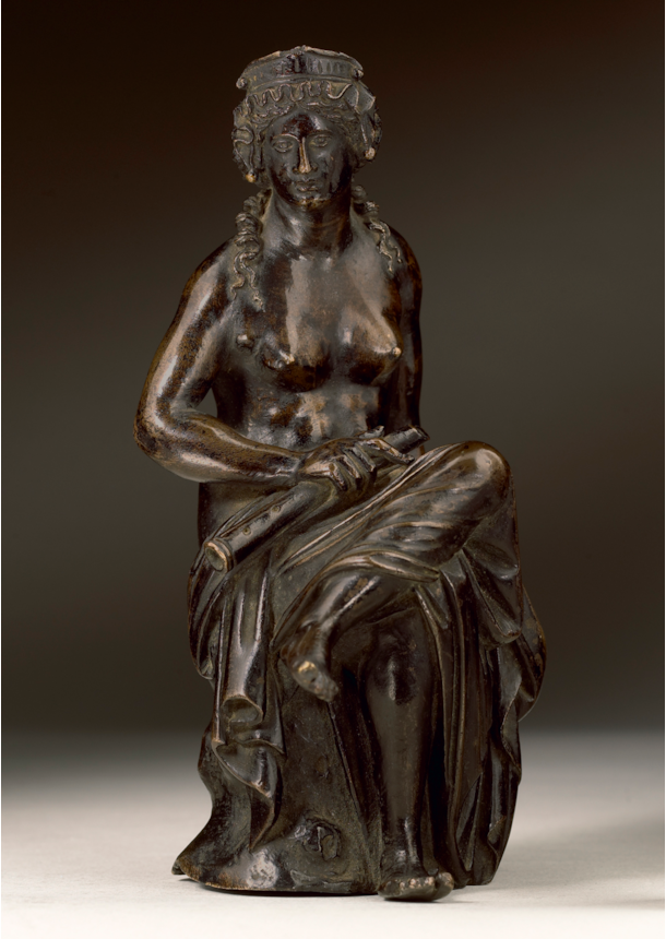 As an image of Euterpe, the muse of music and lyric poetry, the statuette would have been made in response to the demand amongst the educated elites in mid sixteenth-century Europe for tangible modern interpretations of the personalities of the classical world and their legendary life stories. Some of the greatest interpretations of the Classical world made during the first half of the century, from Raphael’s Parnassus to Titian’s scenes from the Metamorphoses painted for King Phillip II of Spain, have never been surpassed as evocations of that world, a realm through the imagined prism of which many of the cultivated citizens of Padua would have sought, to varying degrees, to frame their own lives.