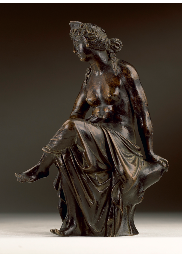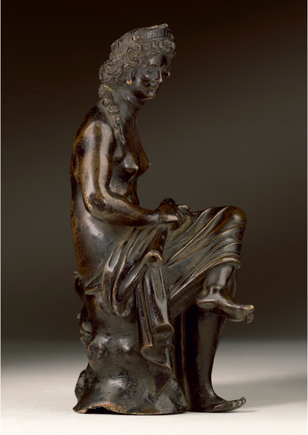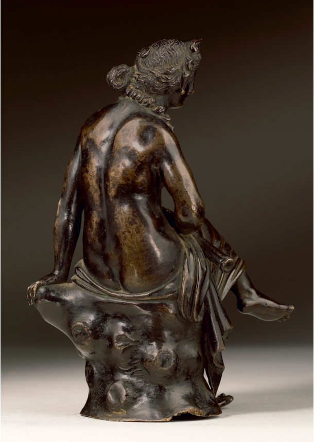 Two earlier small bronze reductions of the ancient marble were made around 1500, the first in Padua by the sculptor Giovanni Fonduli da Crema, the second in Mantua, by Pier Jacopo Alari Bonacolsi, known as Antico, court sculptor to the Gonzaga rulers. Antico’s model was especially influential and the basis for several modified versions of Antico’s model, mostly probably made during the period c. 1525-50. The present bronze is one of the very finest of these variants, but it is exceptional in its successful combination of elements from Antico’s Nymph with strong awareness of the Padua bronze tradition, exemplified by Giovanni Fonduli’s figure, but also the female figures of the Paduan sculptor Andrea Briosco, called Riccio (1470-1532), the greatest maker of small bronze figures in the decades after 1500.