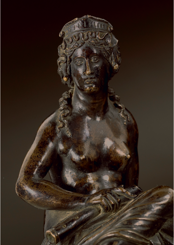 The gifted sculptor who made the bronze statuette seems therefore to have been directly aware not only of Antico’s Mantuan nymph but also of Giovanni Fonduli’s version, probably well-known to artists and collectors in early sixteenth-century Padua. The maker of the present statuette and its cognates seems to have borrowed from Giovanni Fonduli’s version the frontal positioning and the pronounced downwards sloping of the right shoulder. The parallels are at first sight less evident since Giovanni Fonduli’s woman looks to her left and in the present statuette and its cognates, the nymph’s head is turned to her right. The maker of the Euterpe will likewise have noted the elaborate all’antica dressing of the hair in Giovanni Fonduli’s figure, very similar in conception to the heads of female figures by Andrea Riccio, such as the satyress in the Victoria and Albert Museum’s Satyr and Satyress, or the Abundance in the Museo Nazionale del Bargello in Florence. These women, with their sometimes fantastical diadems and carefully gathered and arranged tresses, reflect the explosion of interest in the world of the antique in Northern Italy from the second half of the fifteenth century, exemplified in the influential work of the painter Andrea Mantegna (c. 1431-1506).