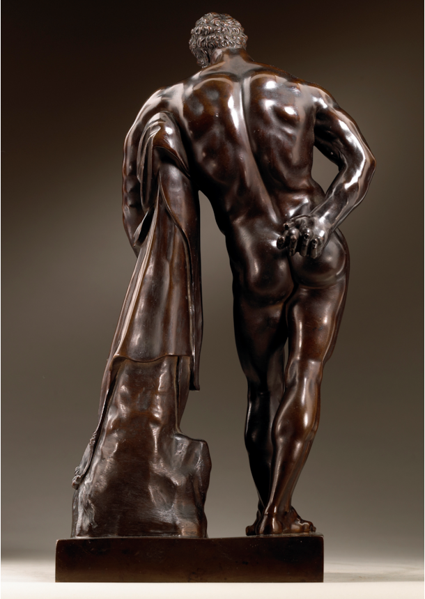 As the name suggests, the present bronze is a reduced version, cast in bronze, of the monumental marble statue of Hercules that once formed part of the great Farnese collection of antiquities (now preserved in the Museo Archeologico Nazionale in Naples). Standing at over three metres tall, the Farnese Hercules is thought to be a Roman copy from the third century A.D., after an original by the Greek master Lysippus.
