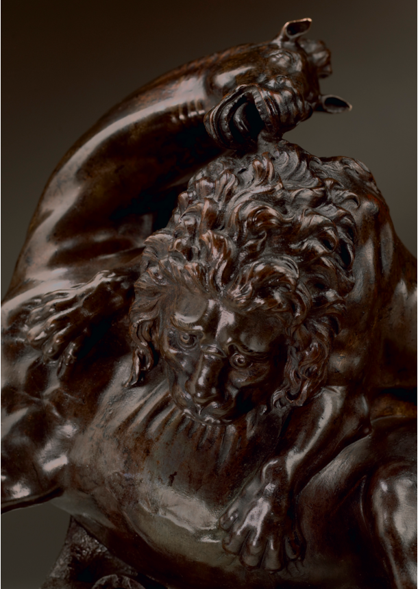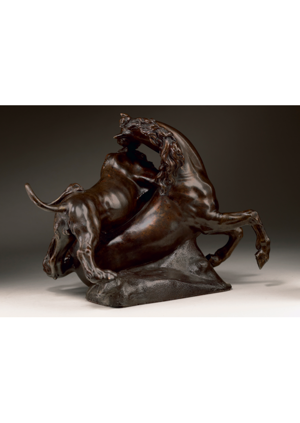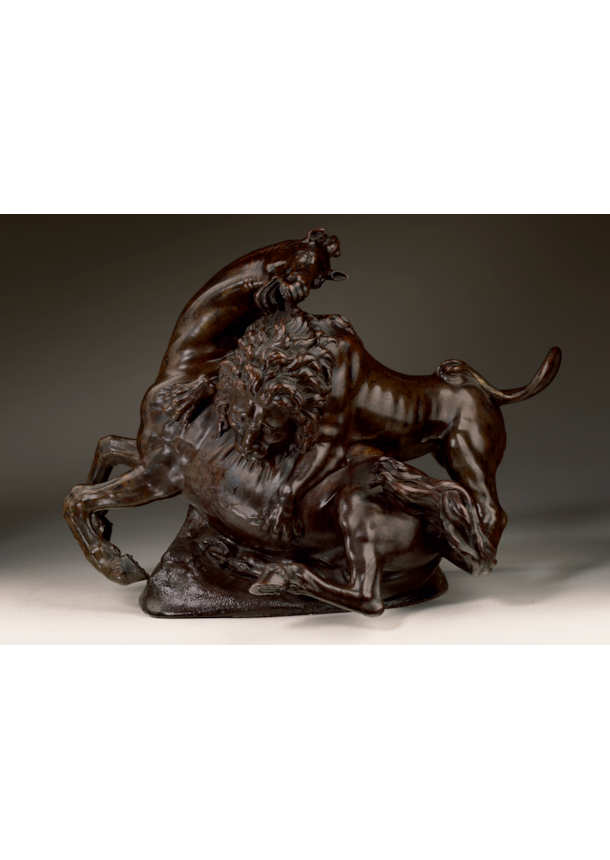 The pair of bronzes do not appear in any contemporary inventories and are absent from the literature until Zeh’s list of authentic bronzes in 1611. This suggests that they were created during Giambologna’s later years, a period when Antonio Susini was casting his models. However, they likely predate Bescapé’s 1594 restoration of the original group. These two closely integrated compositions exemplify Giambologna’s enduring engagement with classical sculpture while also reflecting his growing interest in animal subjects, which emerged after he had achieved mastery in the representation of the human form.