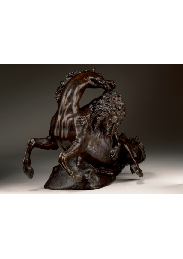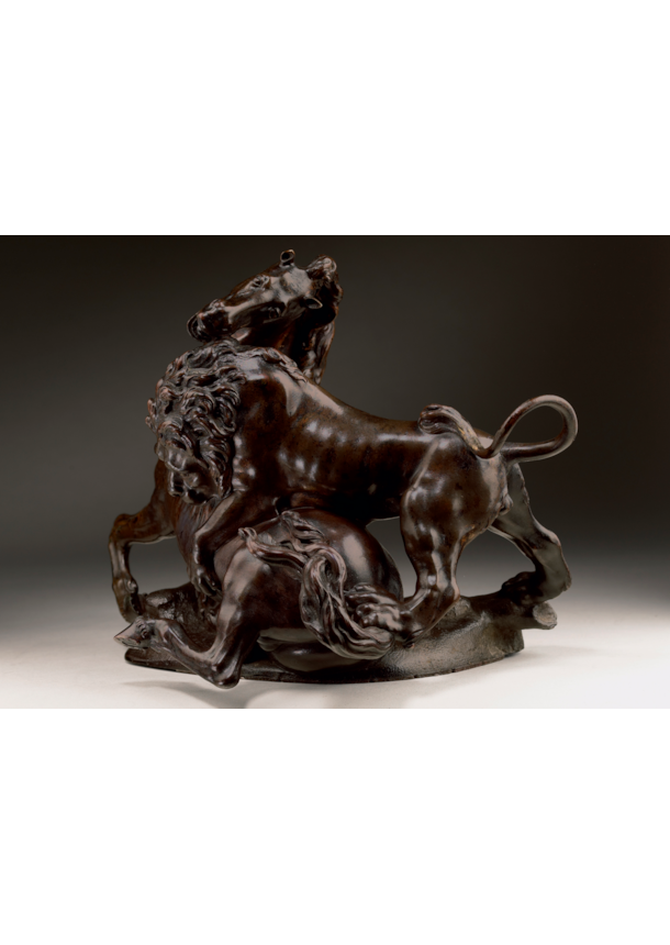 Finely cast, the present bronze depicts a Lion attacking a horse, a composition derived from the monumental ancient marble sculpture previously housed in the courtyard of the Palazzo dei Conservatori on the Campidoglio in Rome, and now in the exedra of Marcus Aurelius in the Capitoline Museums. This sculpture was among a select group of ancient marbles, such as the Belvedere Torso and the Cesi Juno, that Michelangelo’s contemporaries reported he greatly admired, describing it as meravigliosissimo, praising its artistic merits.